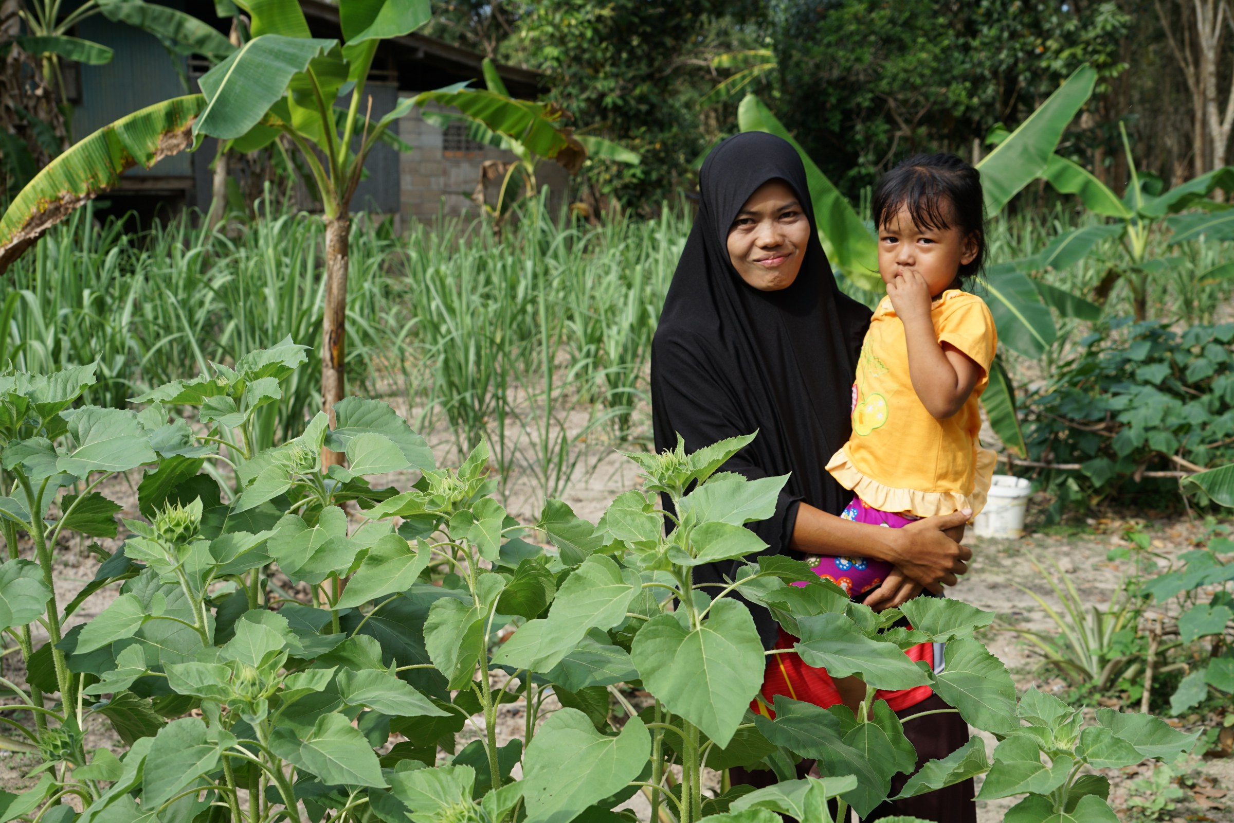 ด้าน “นางนูรียะห์ บือราเฮง” ที่ชักชวนสมาชิกในครอบครัวทุกคนมาร่วมกันปลูกและดูแลผักในที่ดินของตนเองซึ่งเดิมเป็นพื้นที่ว่างเปล่าเล่าให้ฟังว่า ตอนนี้ปลูกทานตะวัน, ฟักเขียว, อ้อย, แตงกวา, ถั่วฟักยาว, กระเจี๊ยบ, บวบเหลี่ยม, บวบงู และผักสวนครัวต่างๆ โดยต้นทานตะวันนั้นปลูกเพื่อเอาเมล็ดพันธุ์มาเพาะเป็นต้นอ่อนทานตะวัน ส่วนอ้อยนั้นก็ปลูกเพื่อที่จะนำมาคั้นเป็นน้ำอ้อยขาย
