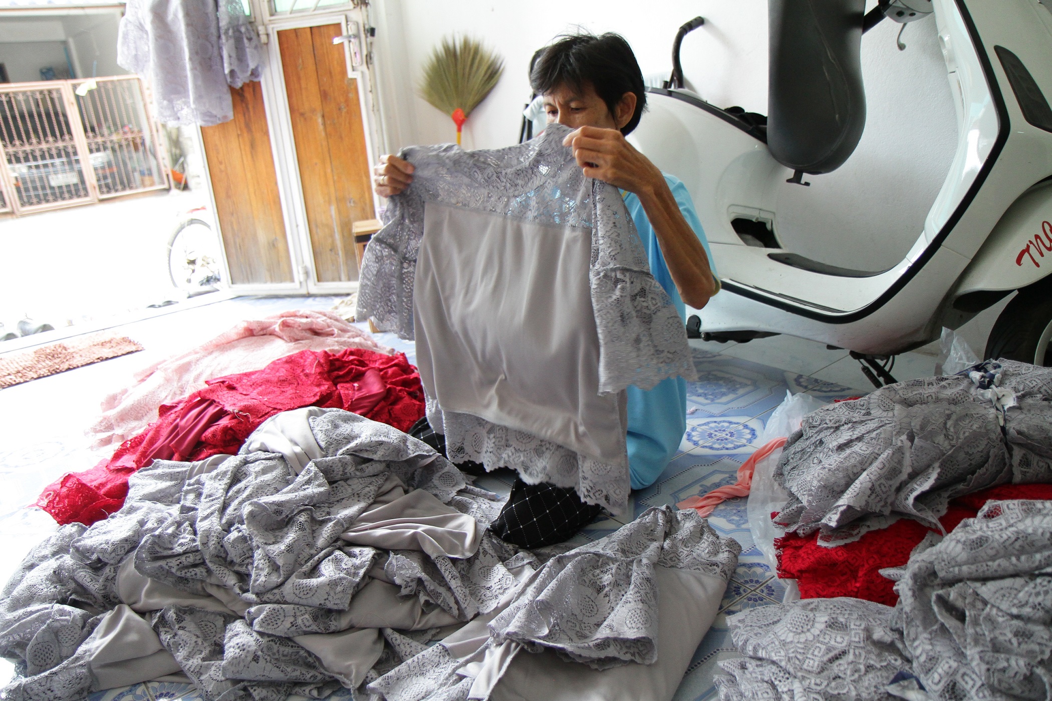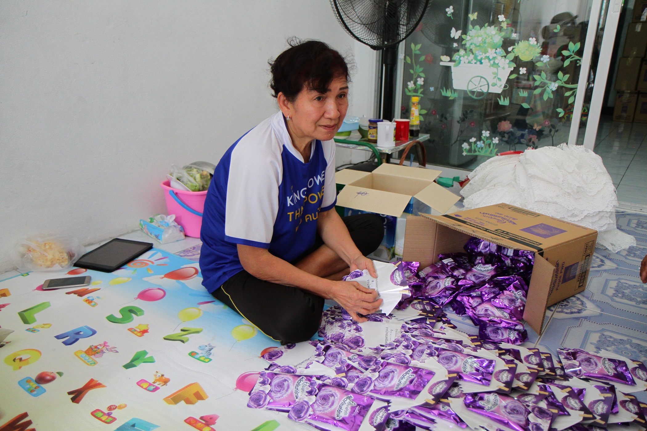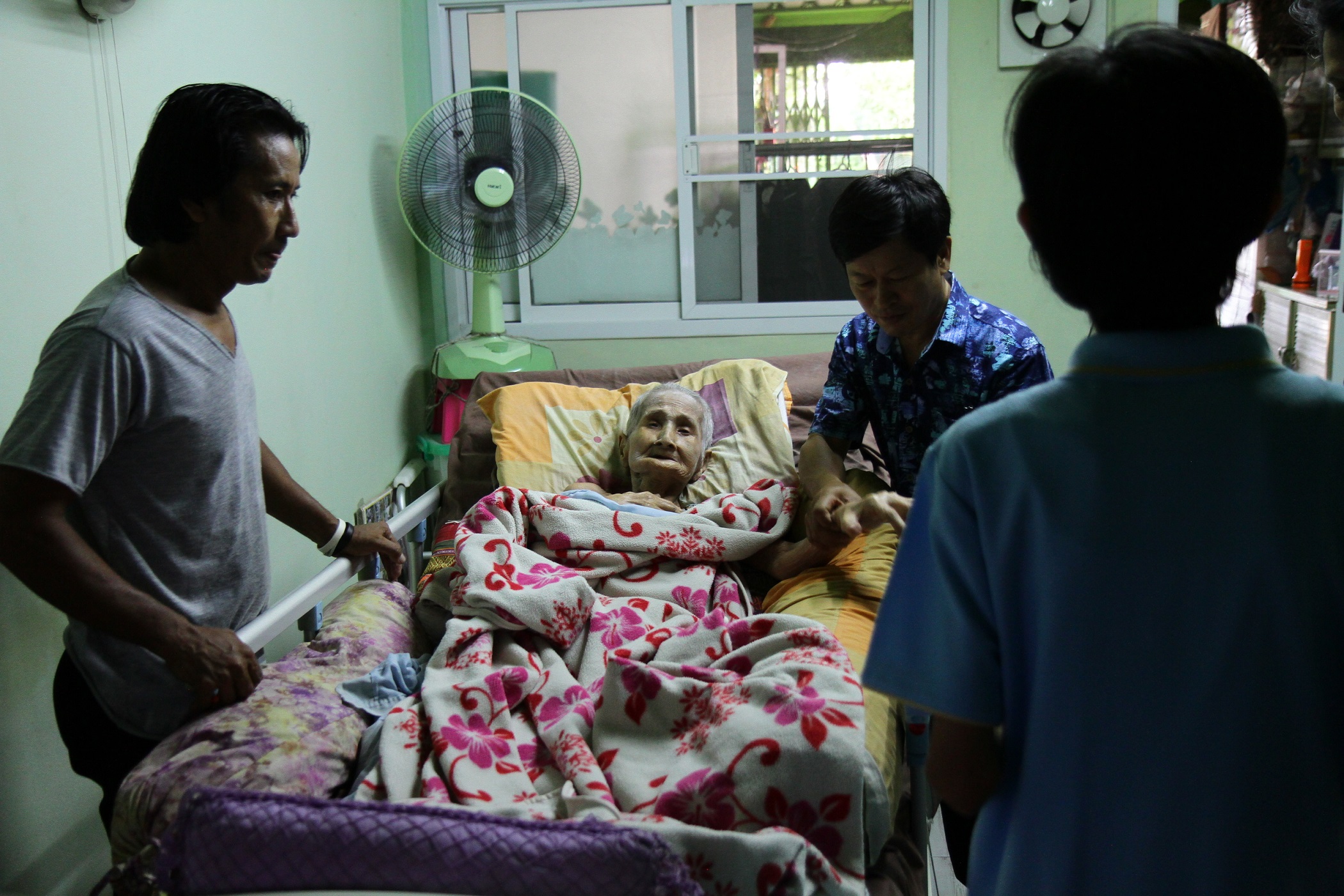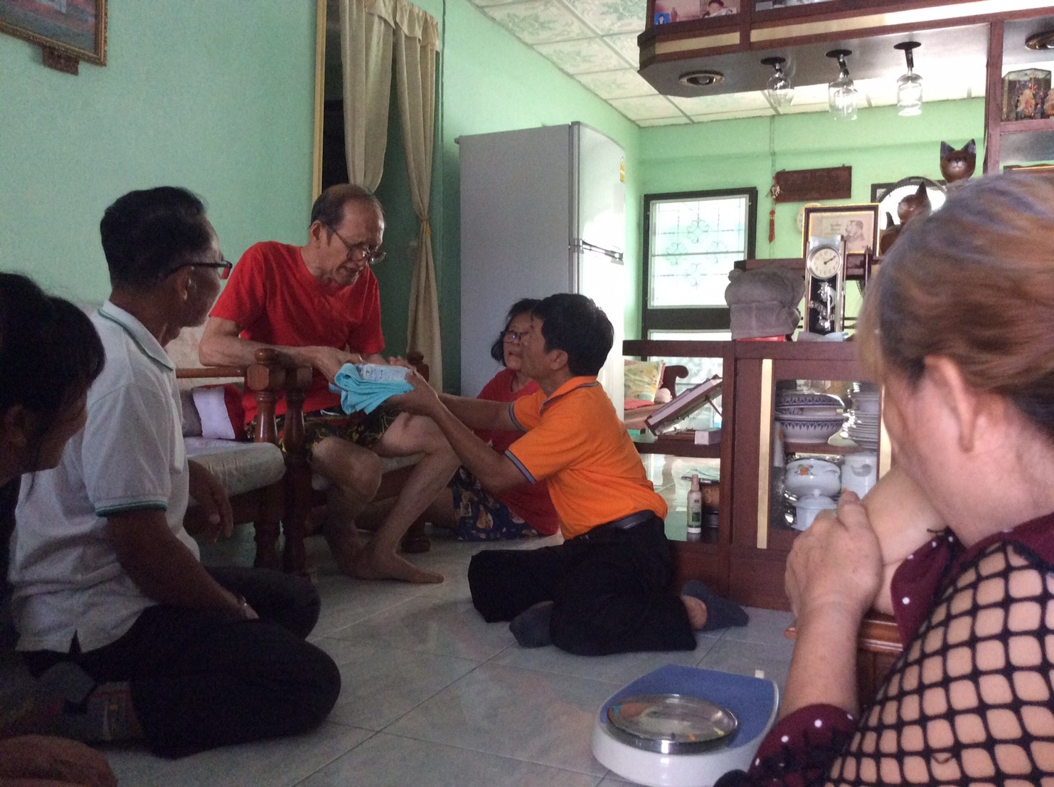 ส่วนผู้สูงอายุที่ป่วยติดเตียง ซึ่งมีอยู่ 2 ราย พวกเราก็จะหากระเช้าเข้าไปเยี่ยมบ่อยๆ คอยไปให้กำลังใจ โดยนำทีม อสม. เข้าไปช่วยดูแลอีกทางหนึ่ง นอกจากสุขภาวะทั้ง 4 มิติจะได้รับการเอาใจใส่เป็นพิเศษแล้ว อีกสิ่งหนึ่งที่เรามองเห็นความสำคัญเช่นกัน นั่นคือ การส่งเสริมการสร้างรายได้ให้ผู้สูงวัย โดยคณะกรรมการชุมชนจะคอยรับงานออเดอร์การติดป้ายฉลากสินค้าจากโรงงาน หรืองานจิปาถะต่างๆ มากระจายให้ผู้สูงอายุที่อยากทำ นอกจากนี้ยังมีการเย็บเสื้อผ้าสำเร็จรูป ซึ่งงานจะมีให้ตลอด แม้จะเป็นเงินที่ไม่เยอะ แต่อย่างน้อยก็เป็นรายได้อีกทางหนึ่ง และที่สำคัญ ได้ใช้เวลามาทำอะไร มานั่งจับกลุ่มทำร่วมกัน คุยสนุกสนาน เฮฮา ดีกว่าอยู่เฉยๆ เสียอีก