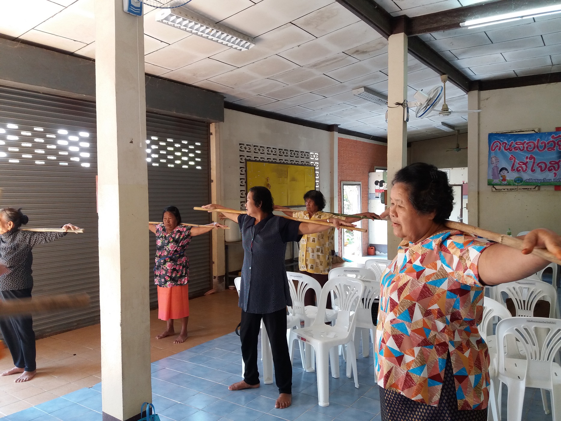 ครูยา บอกว่า ต่อมาทุกวัน อังคาร พุธ และพฤหัสบดี ผู้สูงอายุทุกคนที่ไม่มีธุระหรือป่วยติดบ้านติดเตียงก็จะมารวมตัวกันดำเนินกิจกรรมตามหลัก 3 อ ได้แก่ ออกกำลังกายยืดเส้นยืดสายด้วย รำไม้พลอง รำวง เต้นบาสโลป โยคะ จนชำนาญกว่า 20 คนที่สามารถไปออกงานแสดงได้ด้วย ส่วนด้านอาหาร มาพูดคุยถึงอาหารการกิน ว่าต้องกินอาหารที่ดีต่อสุขภาพ ลดหวาน มัน เค็ม ซึ่งเสี่ยงต่อการเกิดโรคเบาหวาน ความดัน โดยในส่วนอาหารนี้จะให้ทุกคนนำอาหารมาจากที่บ้านใครบ้านมัน แล้วมาชิมดูจะได้รู้ว่าผู้สูงอายุแต่ละบ้านทานอาหารรสชาติแบบไหน ก็จะมีคุณหมอคอยให้คำแนะนำในด้านโภชนาการ