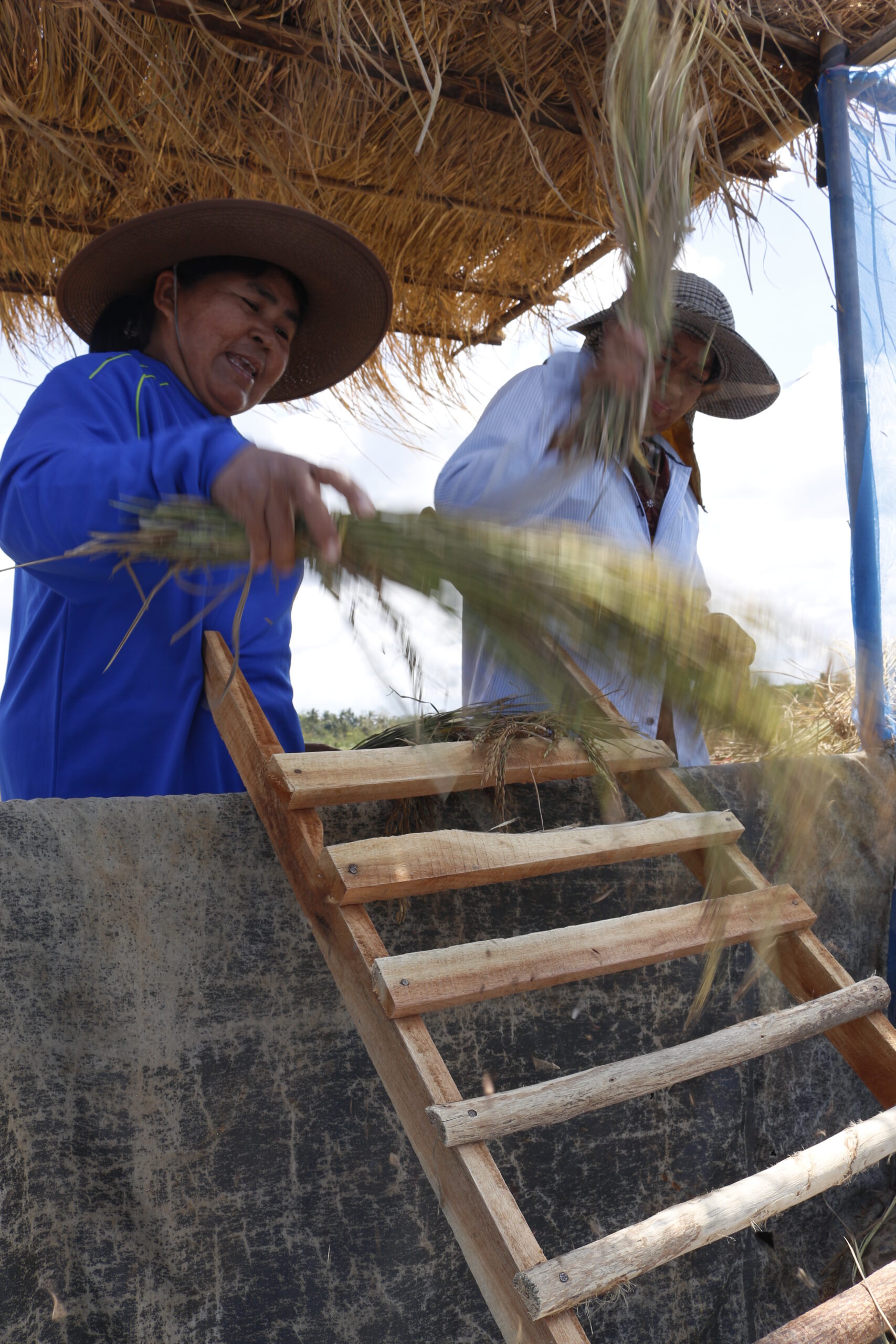 “เมื่อก่อนเวลาทำนาก็อยากเห็นผลผลิตไวๆ อยากได้มากๆ โดยไม่คำนึงถึงสุขภาพ ระยะหลังมานี้ไม่มีแล้ว ผมเป็นผู้ใหญ่บ้านก็ต้องลองก่อน ทำแล้วก็เห็นผลเลยนะว่าผลผลิตก็อยู่ที่ 800 กิโลกรัมต่อไร่ ปีหนึ่งทำสองครั้งก็น่าพอใจ เพราะต้นทุนลดลงได้เยอะ” แกนนำคนสำคัญของหมู่บ้านกล่าว