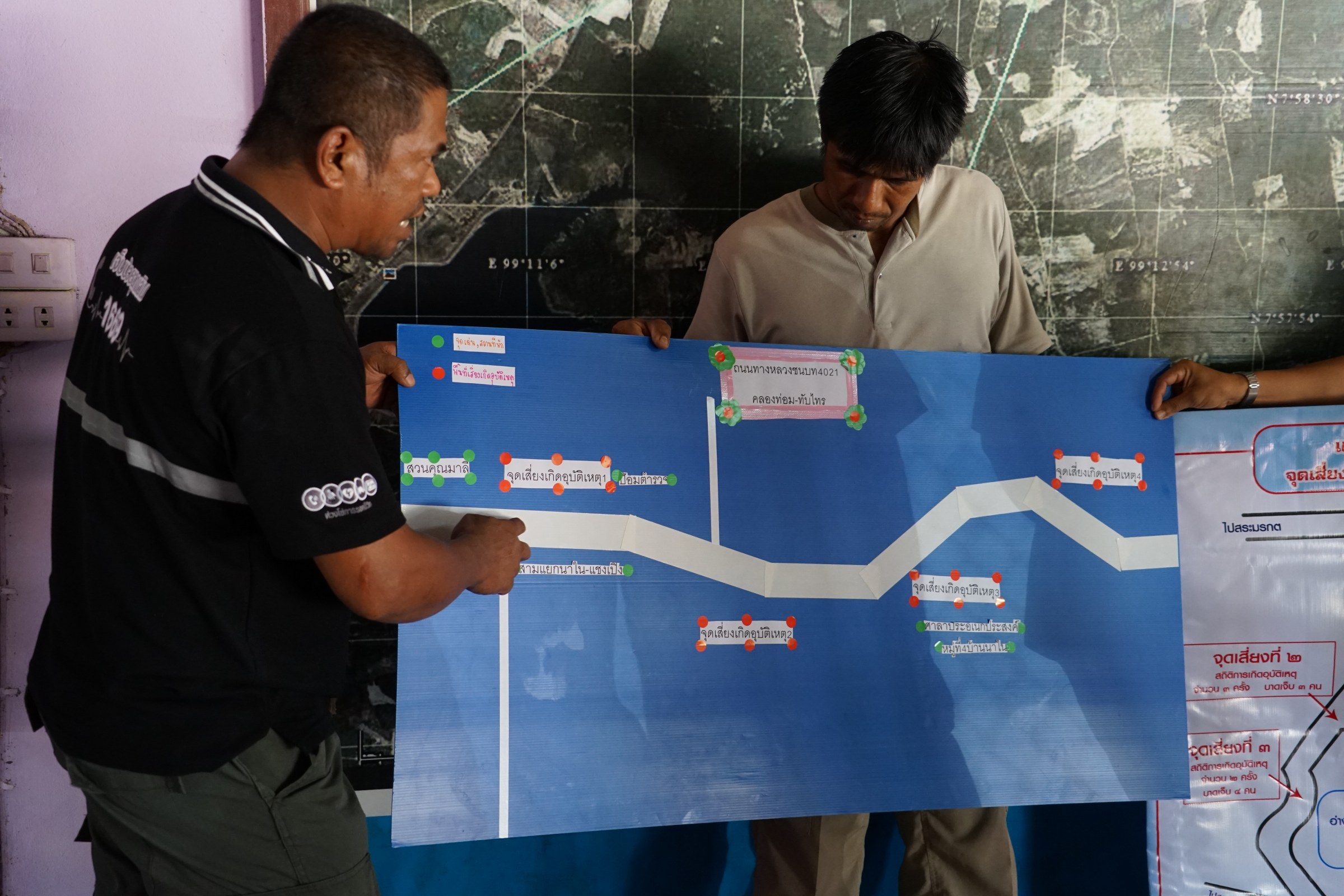 ซึ่งทั้ง 2 โครงการนี้ได้นำข้อมูลอุบัติเหตุและความสูญเสียที่ประเมินค่าไม่ได้ มาใช้เป็นเครื่องมือในการสร้างความตระหนักให้เกิดขึ้นกับสมาชิกในชุมชน ทั้งเรื่องของการรณรงค์การขับขี่อย่างปลอดภัย สวมหมวกนิรภัย เมาไม่ขับ พร้อมกันนี้ยังได้ชักชวนสมาชิกจากทั้ง 2 ชุมชนออกไปตัดต้นไม้ปรับปรุงแก้ไขสภาพภูมิทัศน์สองข้างทางที่บดบังทัศนวิสัยในการขับขี่ รวมไปถึงมีการจัดตั้งอาสาสมัครเฝ้าระวังในจุดเสี่ยงต่างๆ ในช่วงเทศการต่างๆ มีการทำป้ายบอกทางหรือแจ้งพื้นที่เสี่ยงสำหรับคนในชุมชน และกำลังจะขยายผลการจัดทำป้ายเตือนในจุดต่างๆ เป็นภาษาทั้งอังกฤษและจีนในระยะต่อไป