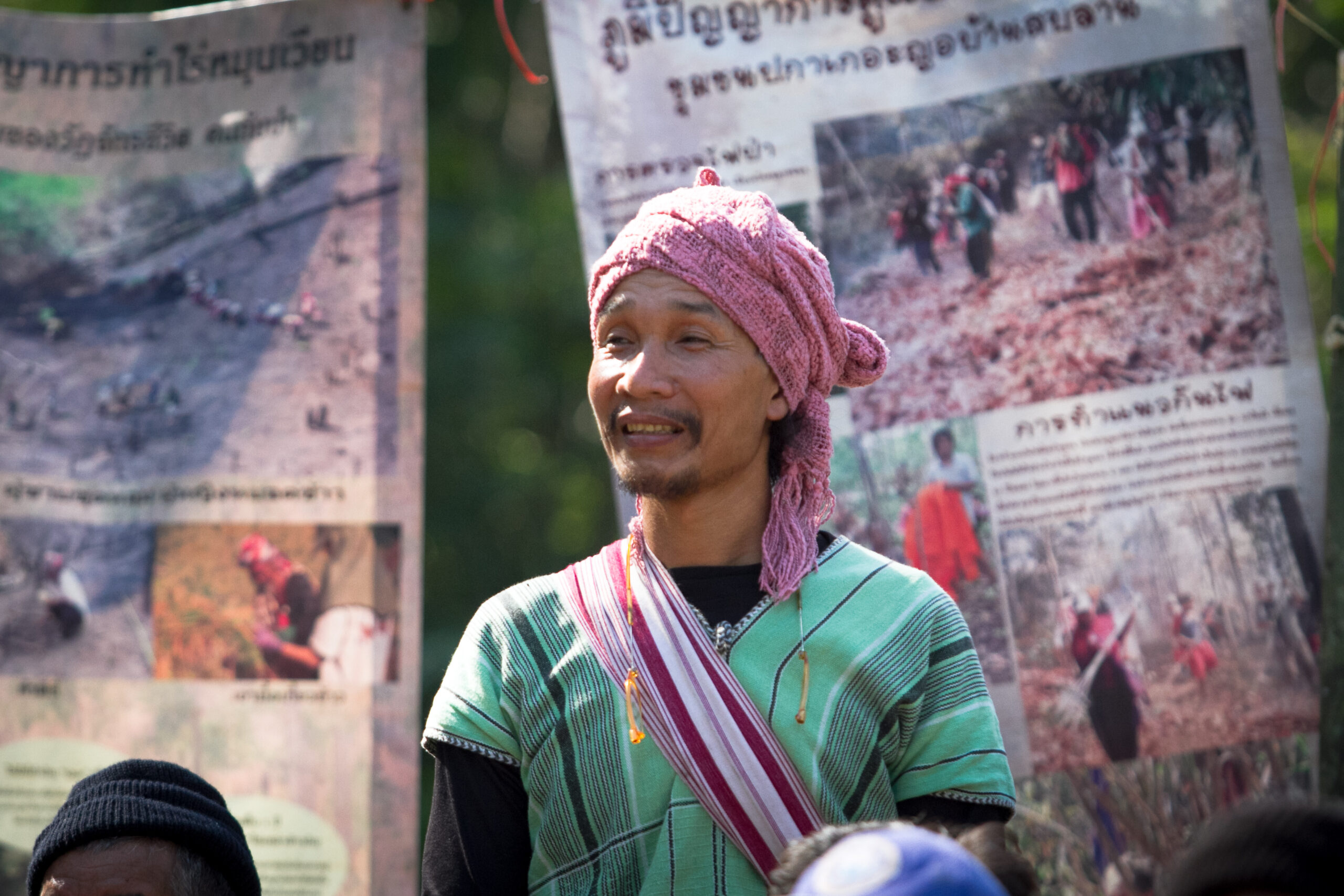 ในเวทีเสวนา “วิถีชีวิตคนอยู่กับป่าให้ยั่งยืนได้อย่างไร” ปราชญ์ชาวกะเหรี่ยงบ้านสบลาน “พะตีตาแยะ ยอดฉัตรมิ่งบุญ” เล่าให้ฟังถึงประวัติของหมู่บ้าน การเข้ามาของสัมปทานป่าไม้ที่เข้ามาจัดการกับไม้มีค่าตั้งแต่รุ่นปู่ ทั้งไม้สัก ไม้กระยาเลย ถูกตัดและขนออกไป โดยชาวบ้านได้แต่มองตาปริบๆ แม้ตัวของพะตีเองเมื่อสมัยวัยรุ่นยังต้องรับจ้างจากป่าไม้ไปตีตราต้นไม้ที่จะตัด