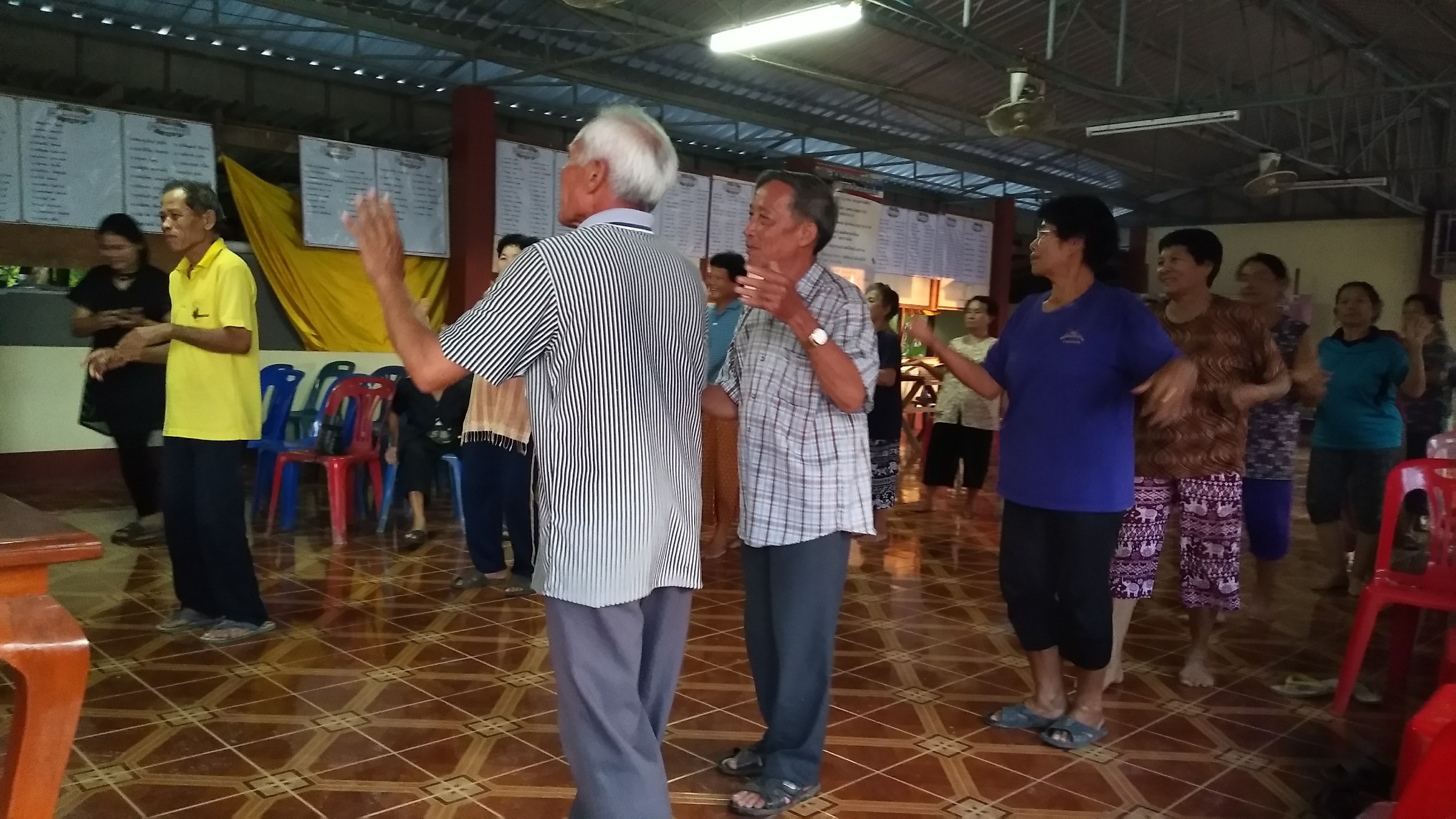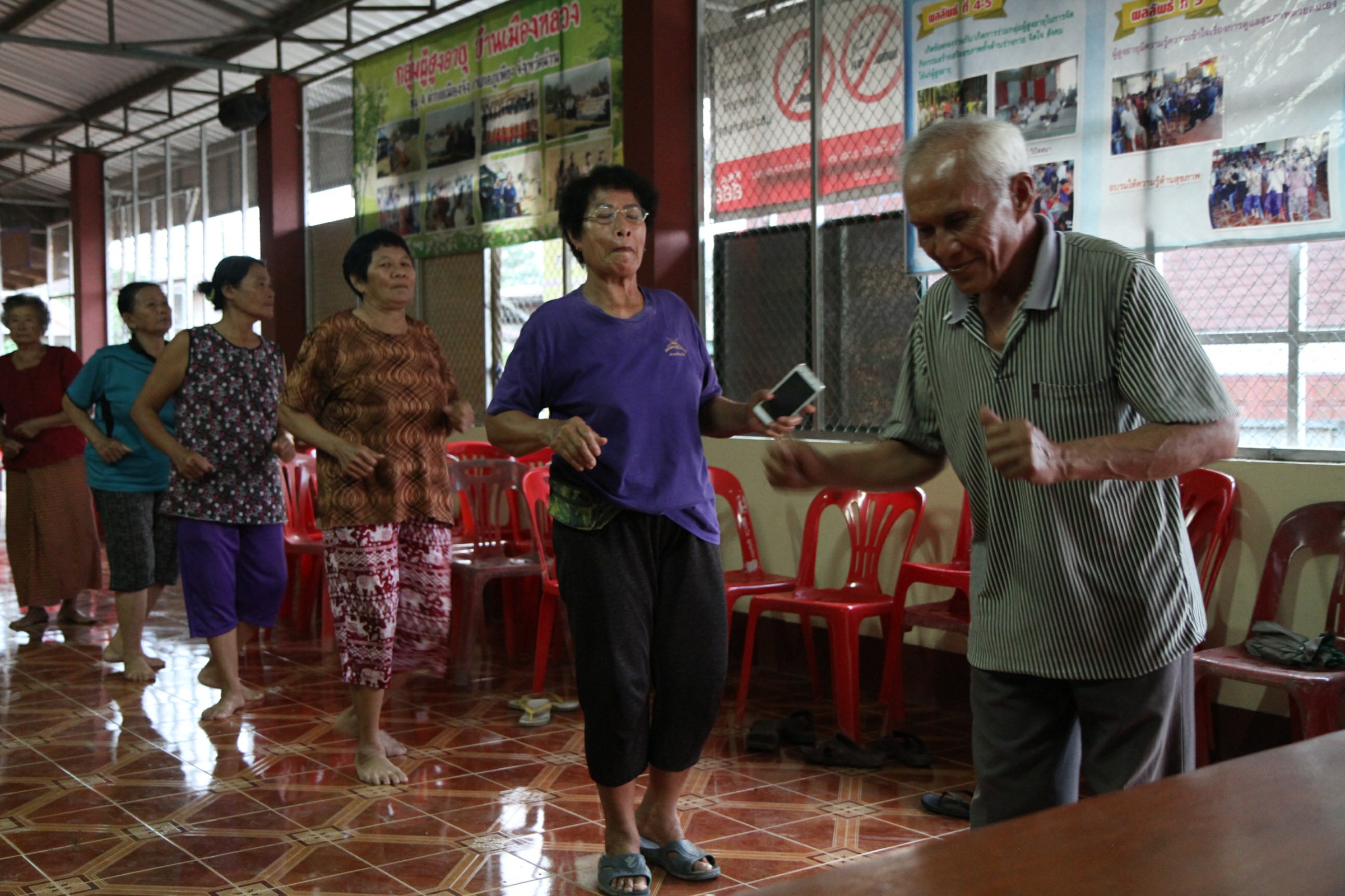 พอแช่มือแช่เท้าเสร็จ ก็จะร่วมกิจกรรมออกกำลังกาย ซึ่งผู้ชายส่วนใหญ่เลือกโยนลูกเปตอง แต่ผู้หญิงเลือกรำวงย้อนยุค มีผู้ชายเพียงบางส่วนที่ร่วมทำกิจกรรมทั้ง 2 อย่าง หากก่อนที่ออกกำลังกายจะมีอาสาสมัครสาธารณสุขประจำหมู่บ้าน (อสม.) กับทางเจ้าหน้าที่โรงพยาบาลส่งเสริมสุขภาพตำบลเมืองจัง มาช่วยวัดความดันโลหิตทุกครั้ง ป้องกันผลกระทบที่จะเกิดกับผู้สูงอายุ ในกรณีที่มีความดันโลหิตสูง หรือต่ำผิดปกติ