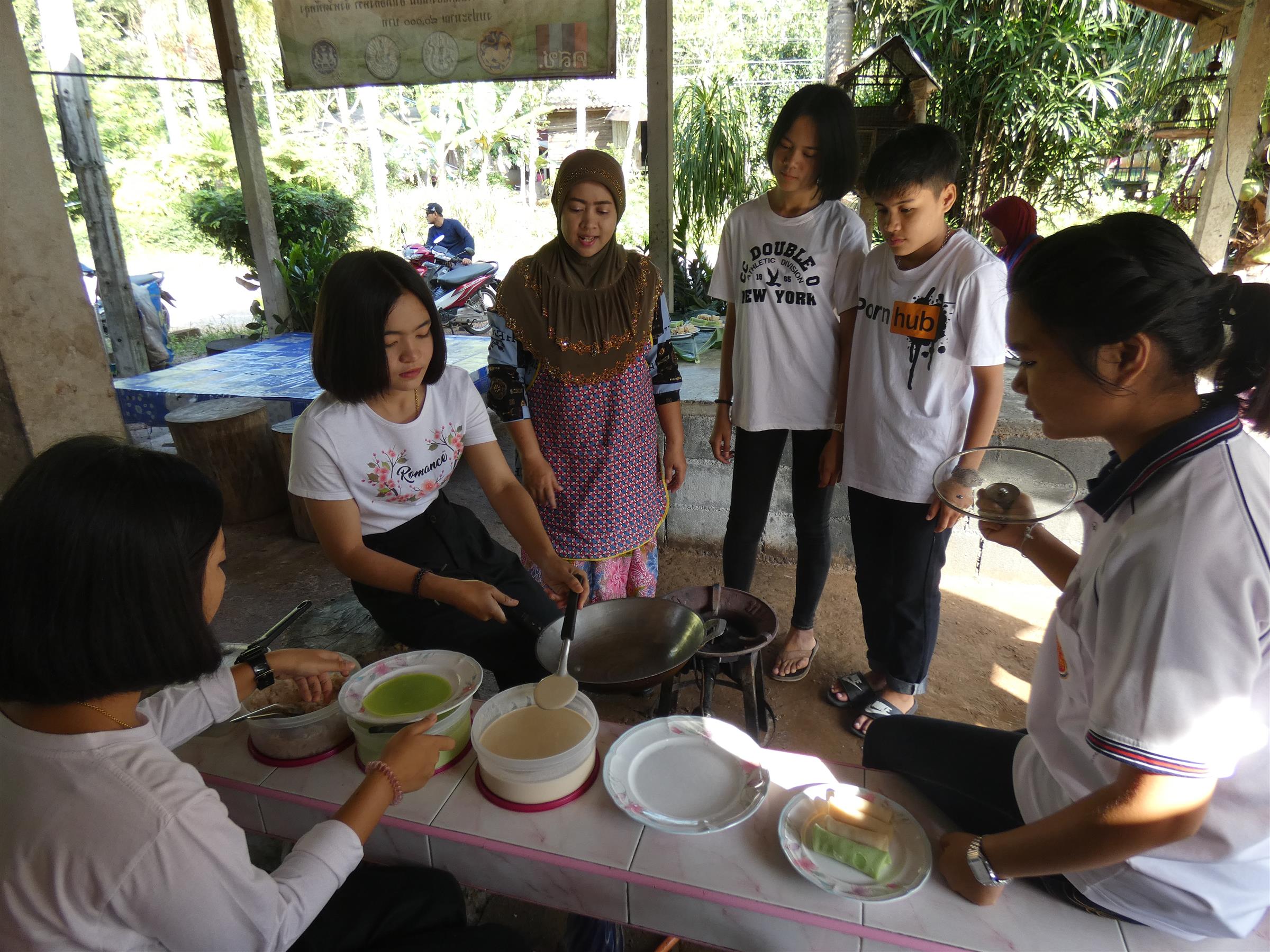 “เราจะชักชวนน้องๆ จากโรงเรียนบ้านควนประกอบลงไปพื้นที่สำรวจขนมพื้นบ้าน เพื่อที่จะค้นหาว่าในชุมชนของเรานั้นมีขนมอะไรบ้าง อย่างเช่น ขนมจากก็ทำให้เด็กๆ ได้เห็นความเชื่อมโยงว่าในชุมชนของเรามีพื้นที่อยู่ริมคลองและมีต้นจากขึ้นอยู่เราจึงมีขนมชนิดนี้ไว้ทานกันได้” นัสกล่าว