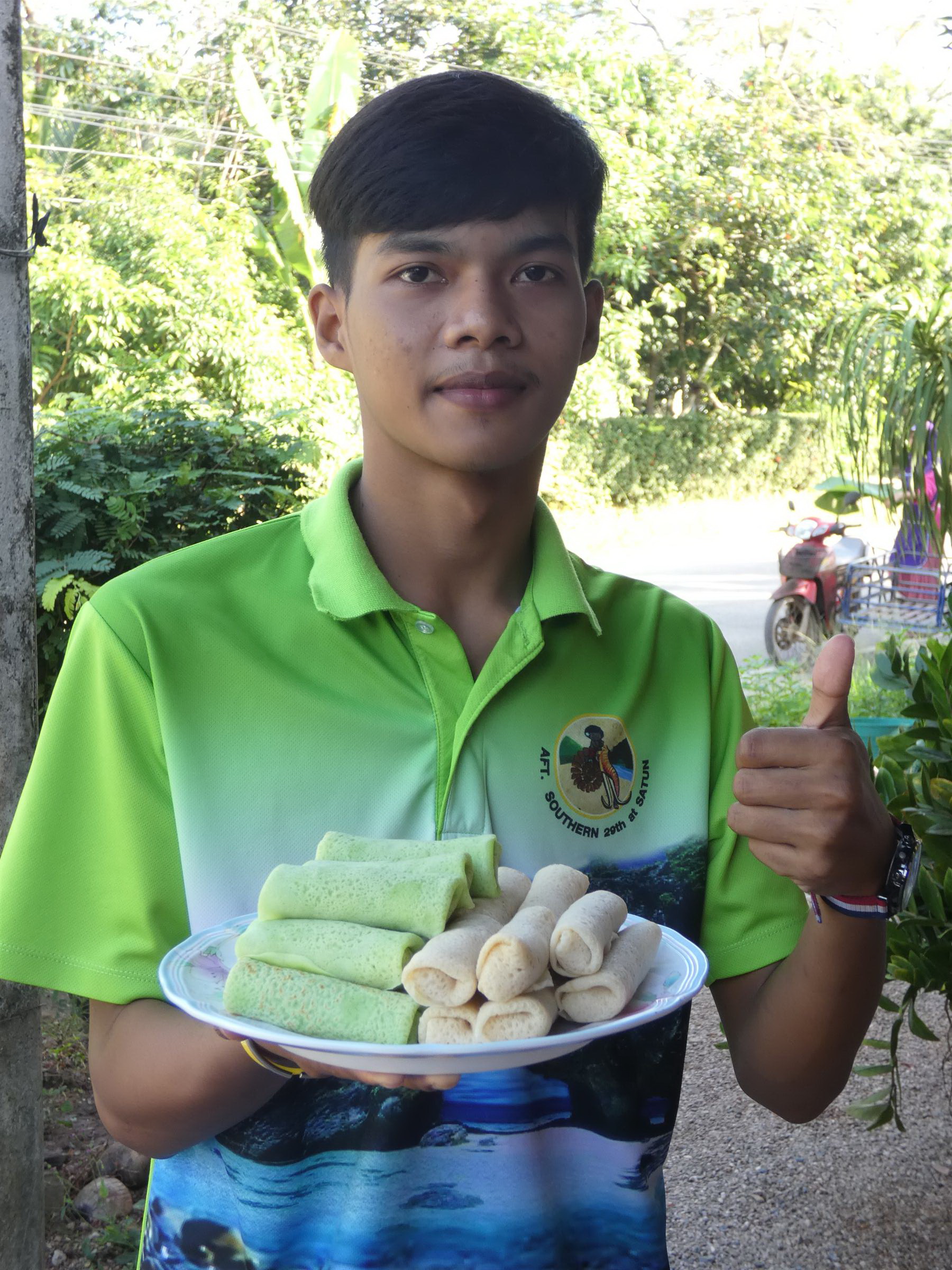 “สำหรับวันนี้เราพาเพื่อนๆ และน้องๆ พามาเรียนรู้ขนมตาหยาบ แล้วก็ขนมค่อมสาคูไส้ถั่วเขียวอย่าง ขนมตาหยาบ ก็คือหากินได้ยาก เพราะถ้าไม่สำรวจในชุมชนก็แทบจะไม่รู้ด้วยซ้ำว่ามันมีอยู่จริงๆ ซึ่งคนในชุมชนก็ยังตกใจด้วยซ้ำว่ามีอยู่ หรือขนมค่อมสาคูที่คนไม่รู้จักและเกือบจะหายไปแล้ว ซึ่งความสำเร็จของโครงการนี้ก็คือทำให้คนชุมชนตระหนัก เห็นคุณค่าและความสำคัญของขนมพื้นบ้าน หลายๆ อย่างต้องช่วยกันรีบฟื้นฟูขึ้นมา ทุกคนจะต้องช่วยกันเป็นฟันเฟืองเล็กๆ ในการขับเคลื่อนฟื้นฟูแล้วก็ต้องช่วยกันอนุรักษ์ต่อไปข้างหน้า” แกนนำเยาวชนหัวหน้าโครงการฯ ระบุ